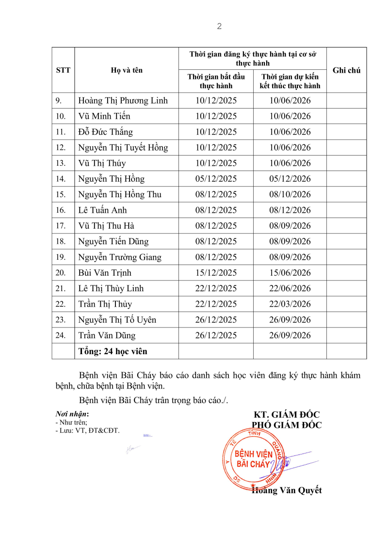 Thông báo 21 danh sách người đăng ký thực hành khám bệnh, chữa bệnh tháng 12 năm 2025