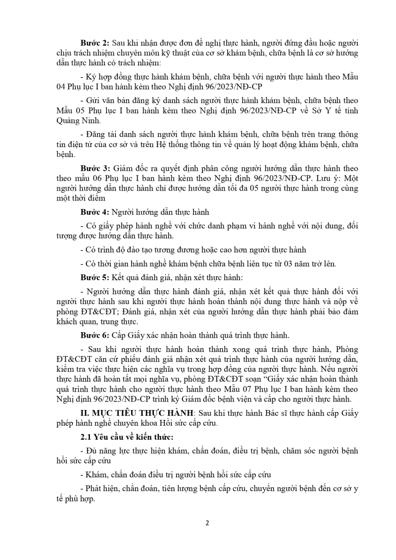 Nội dung thực hành khám bệnh, chữa bệnh đối với bác sĩ cấp giấy phép hành nghề phạm vi hành nghề chuyên khoa HSCC 2026/03/05 03:27