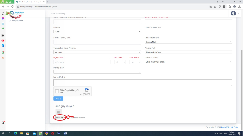 Lưu ý: Nếu khách hàng chuyển viện thì vào phần chọn tập tin để tải phần giấy chuyển viện.