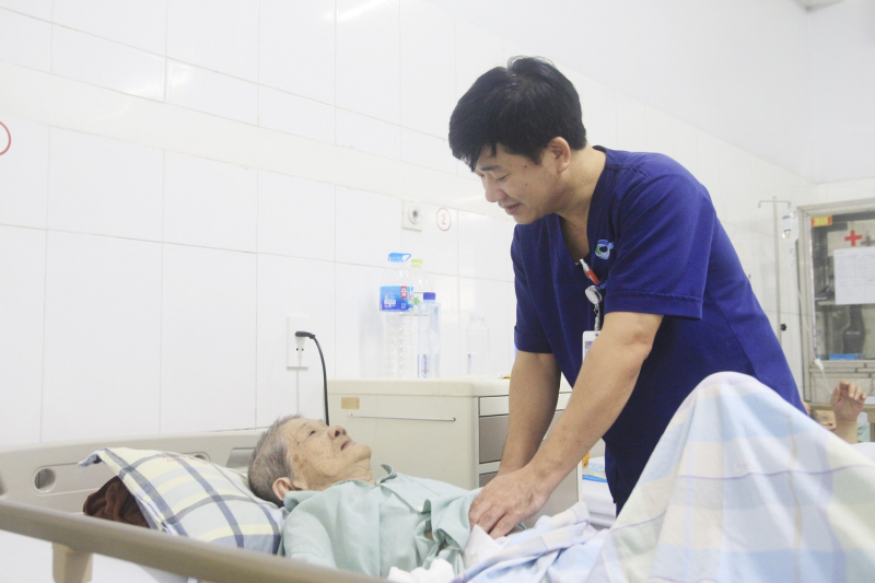 BSCKI Nguyễn Quảng Đại – Trưởng Khoa Nội tiêu hóa, Bệnh viện Bãi Cháy thăm khám cho cụ bà sau quá trình can thiệp, điều trị hồi sức tích cực