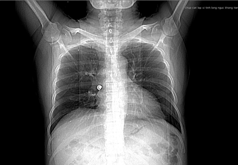 Trước nhập viện bệnh nhân bị ho sặc, tức ngực, khó thở. Tại Bệnh viện Bãi Cháy, bệnh nhân được thăm khám lâm sàng, thực hiện các xét nghiệm, chẩn đoán hình ảnh. Kết quả chụp CT scanner lồng ngực phát hiện vị trí phế quản phải có hình ảnh dị vật phản quang kích thước 17x12mmm. Các bác sĩ đã hội chẩn chuyên khoa hô hấp và chỉ định can thiệp nội soi phế quản để gắp dị vật.