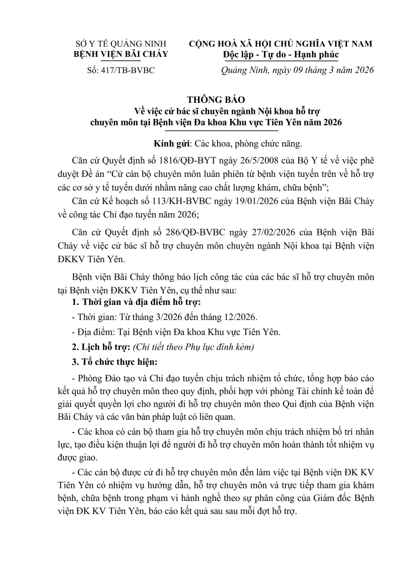 Bệnh viện bãi cháy cử bác sĩ chuyên ngành nội khoa hỗ trợ chuyên môn tại bệnh viện đa khoa khu vực tiên yên năm 2026