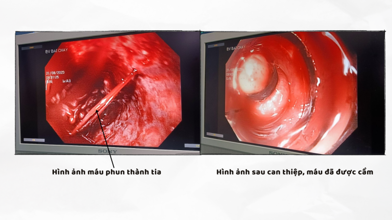 Tiến hành nội soi thấy có nhiều máu đỏ và máu đông trong lòng thực quản, dạ dày, giãn tĩnh mạch thực quản độ III. Vị trí cách CRT gần 30cm có 02 điểm vỡ giãn đang phun thành tia. Kíp can thiệp đã tiến hành thắt các điểm vỡ tĩnh mạch bằng vòng cao su nhưng không thể thắt được do niêm mạc thực quản xơ chai, co kéo, trong tình thế khó, cấp thiết, Bác sĩ đã quyết định kẹp điểm vỡ giãn bằng 02 kẹp clip. Kiểm tra lại sau thủ thuật thấy điểm vỡ giãn đã cầm máu. Kíp nội soi can thiệp do bác sĩ CKI Nguyễn Quảng Đại, Trưởng khoa Nội tiêu hóa cùng ê kíp thực hiện.