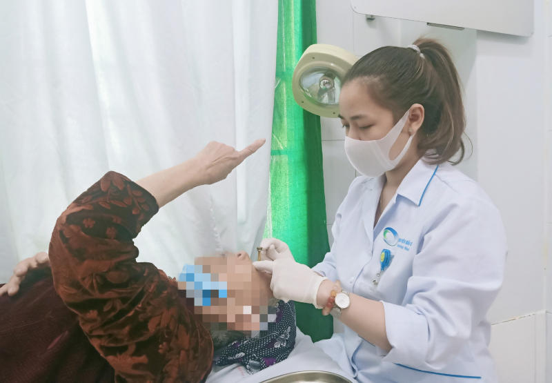 Người bệnh được đo nhãn áp tại phòng khám mắt Bệnh viện Bãi Cháy.
