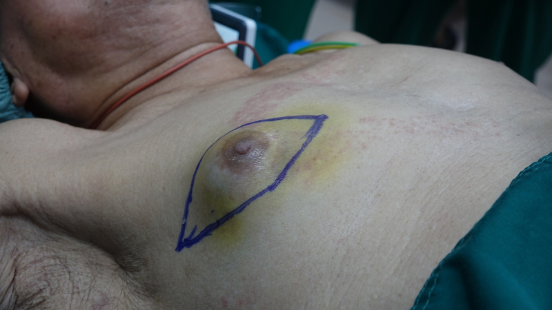 Bệnh nhân Phạm V D (86 tuổi, ở xã Thái Ninh, tỉnh Hưng Yên) có tiền sử tăng huyết áp, khám tại Bệnh viện Bãi Cháy với khối u vùng vú phải phát triển to nhanh, gây đau nhiều ảnh hưởng đến sinh hoạt. Kết quả siêu âm, chụp CTscanner lồng ngực cho thấy phần mềm vùng vú phải có khối u kích thước 47x33x36mm, hạch nhỏ nách hai bên. Kết quả sinh thiết xác định ung thư biểu mô tuyến vú phải giai đoạn cT2N0M0. Các bác sĩ đã hội chẩn chuyên khoa ung bướu quyết định hướng điều trị phẫu thuật cắt tuyến vú phải kèm vét hạch nách nhằm loại bỏ triệt để tổn thương và nguy cơ di căn.