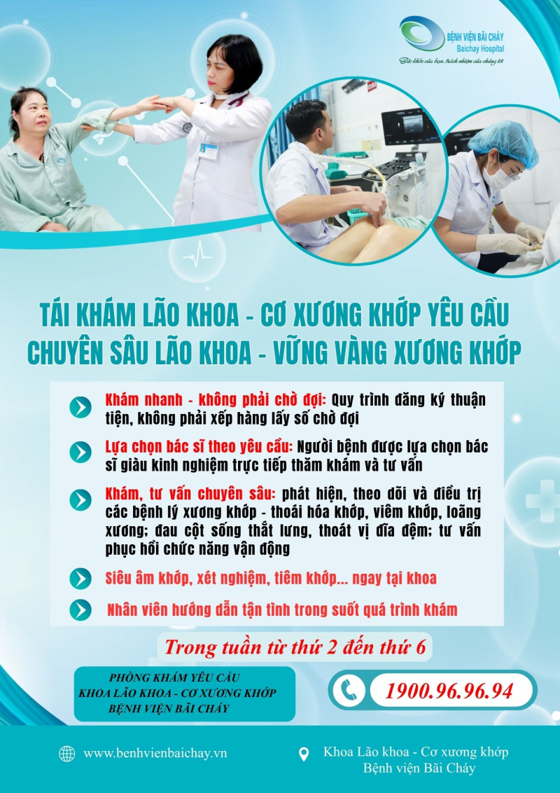 Nhằm đáp ứng nhu cầu ngày càng cao của người dân trong việc tái khám, theo dõi lâu dài và thăm khám chuyên sâu các bệnh lý cơ xương khớp, Khoa Lão – Cơ xương khớp, Bệnh viện Bãi Cháy đã triển khai Phòng khám Lão khoa – Cơ xương khớp theo yêu cầu. Mô hình hướng tới nâng cao chất lượng dịch vụ y tế, mang lại sự thuận tiện, nhanh chóng và hiệu quả trong quá trình khám chữa bệnh, đặc biệt đối với người cao tuổi và người bệnh mắc các bệnh lý mạn tính.