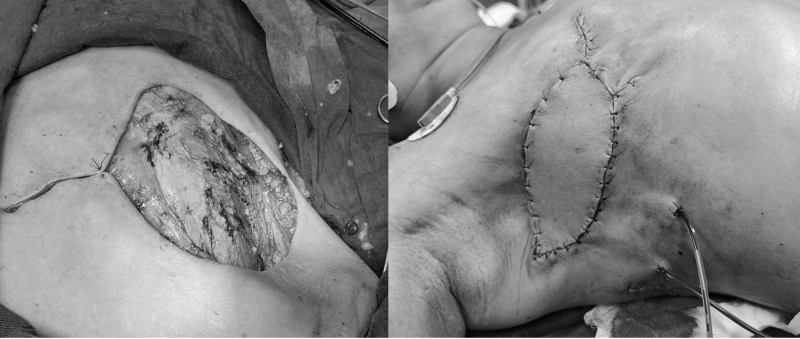 Bệnh nhân Lý T X (48 tuổi, ở xã Quảng La, tỉnh Quảng Ninh) mắc ung thư vú phải giai đoạn tiến triển (cT4N2M0) đã trải qua hóa trị tân bổ trợ. Sau điều trị, khối u có giảm kích thước nhưng vẫn còn xâm lấn cơ ngực lớn và da gây loét da, kèm theo hạch nách. Thăm khám lâm sàng, các bác sĩ ghi nhận tổn thương u kích thước khoảng 4x5cm, loét da, di động hạn chế. Siêu âm, CTScanner ngực có tổn thương u vú phải kích thước 53x22mm, hạch nách phải kích thước lớn nhất 11x14mm, kết quả sinh thiết xác định ung thư biểu mô xâm nhập. Qua hội chẩn chuyên khoa ung bướu, các bác sĩ chỉ định phẫu thuật cắt toàn bộ tuyến vú phải, vét hạch nách, cắt tổn tổn thương do u xâm lấn và tạo hình che phủ bằng vạt da cơ lưng rộng.