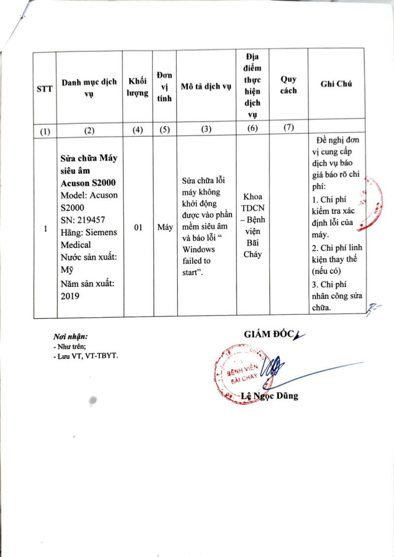Thông báo 1899 nhu cầu sửa chữa máy siêu âm Acuson S2000
