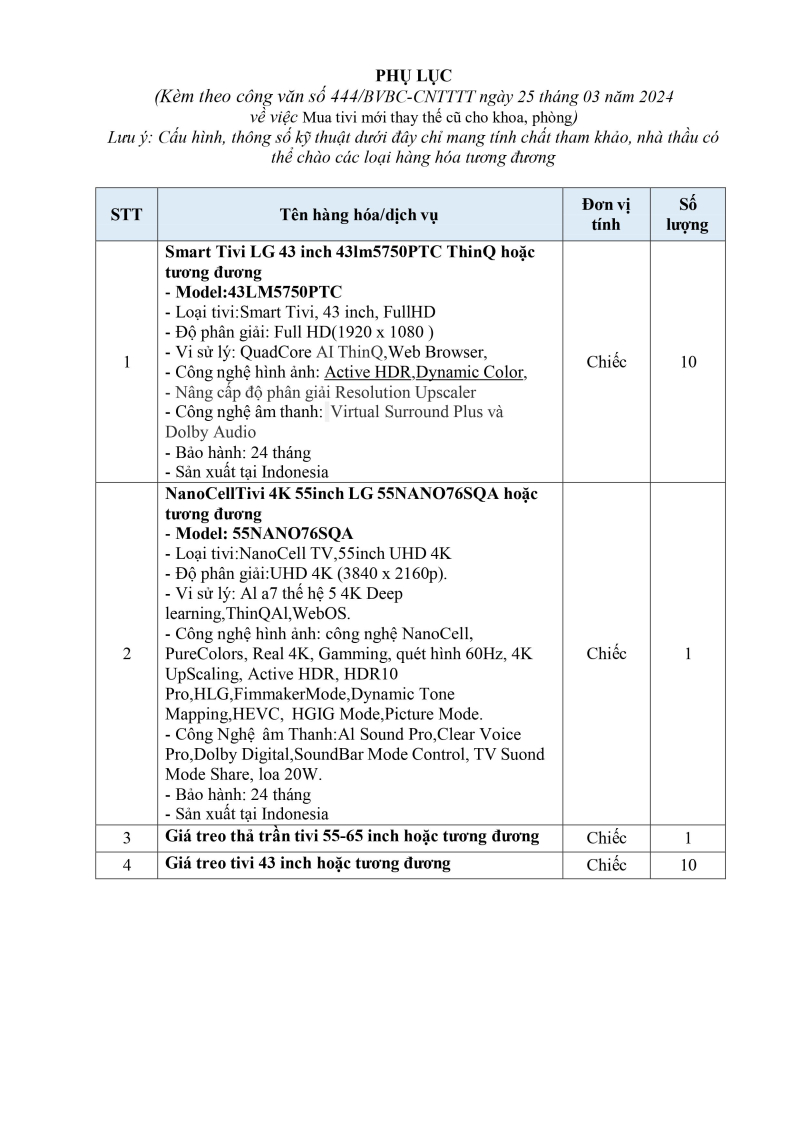 Thông báo 444 mua ti vi thay thế cũ cho khoa, phòng