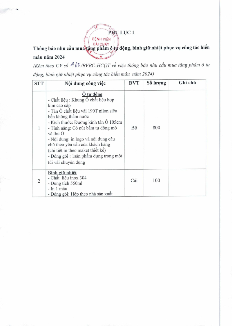 Thông báo 460 nhu cầu mua tặng phẩm ô tự động, bình giữ nhiệt phục vụ công tác hiến máu
