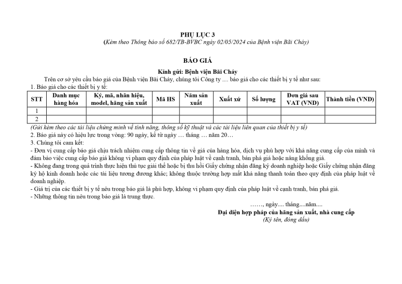 Thông báo 682 báo giá thiết bị y tế phục vụ công tác khám, chữa bệnh tại Nhà thuốc quý II năm 2024