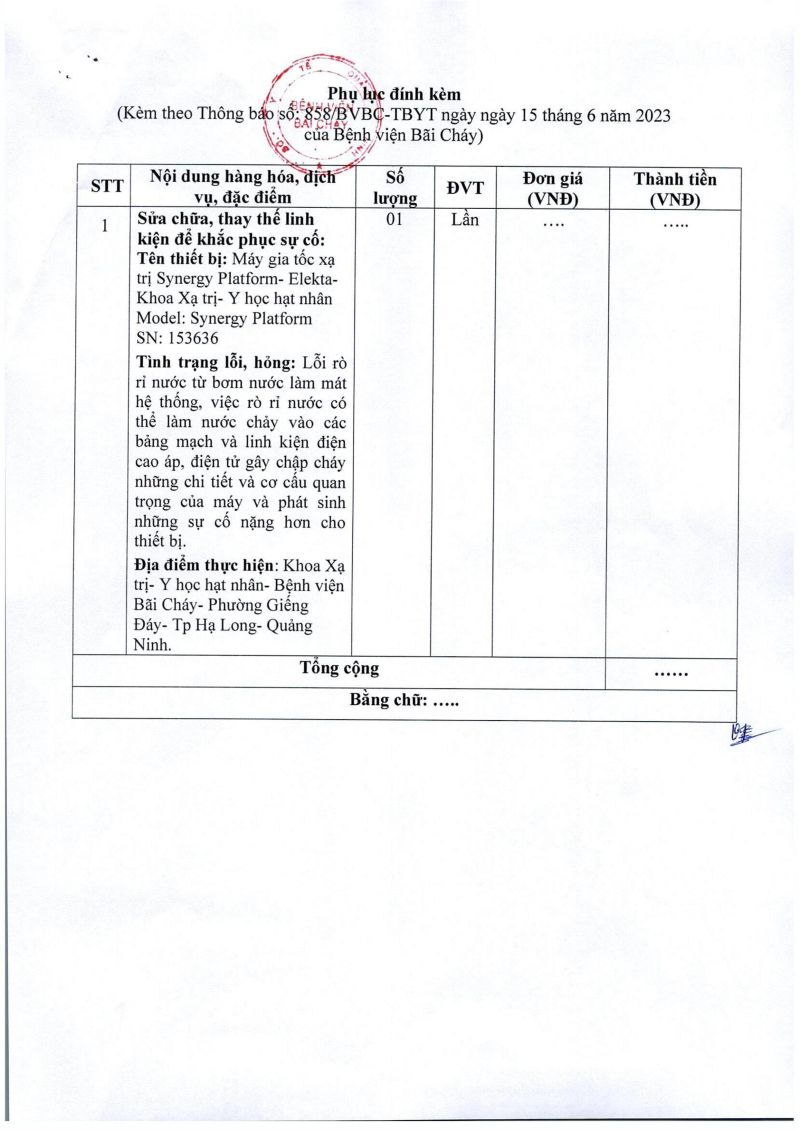 Thông báo nhu cầu sửa chữa máy gia tốc xạ trị Elekta, Synergy Plaform hỏng bơm nước làm mát hệ thống.