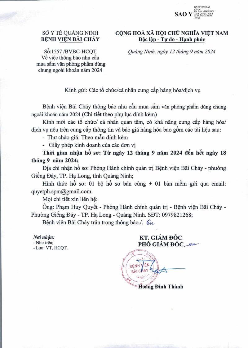Thông báo số 1813/BVBC-VTTBYT về nhu cầu mua sắm vật tư cho máy lọc máu liên tục phục vụ công tác khám, chữa bệnh năm 2024 -2025