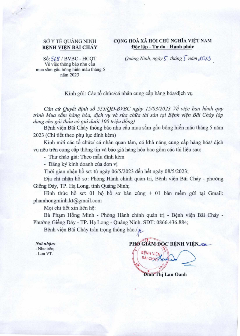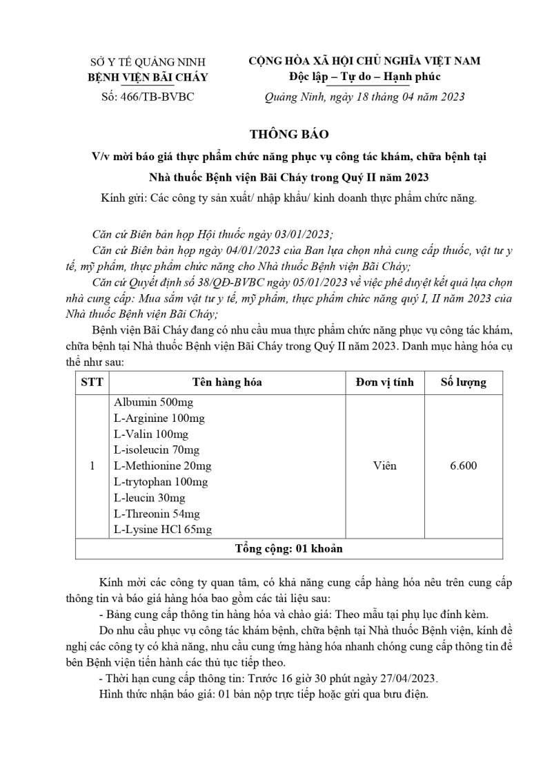 Bệnh viện Bãi Cháy thông báo 1017/BVBC-HCQT về nhu cầu báo giá để xây dựng báo giá mua vật tư, thiết bị thay thế, sửa chữa điện nước phục vụ hoạt động bv.