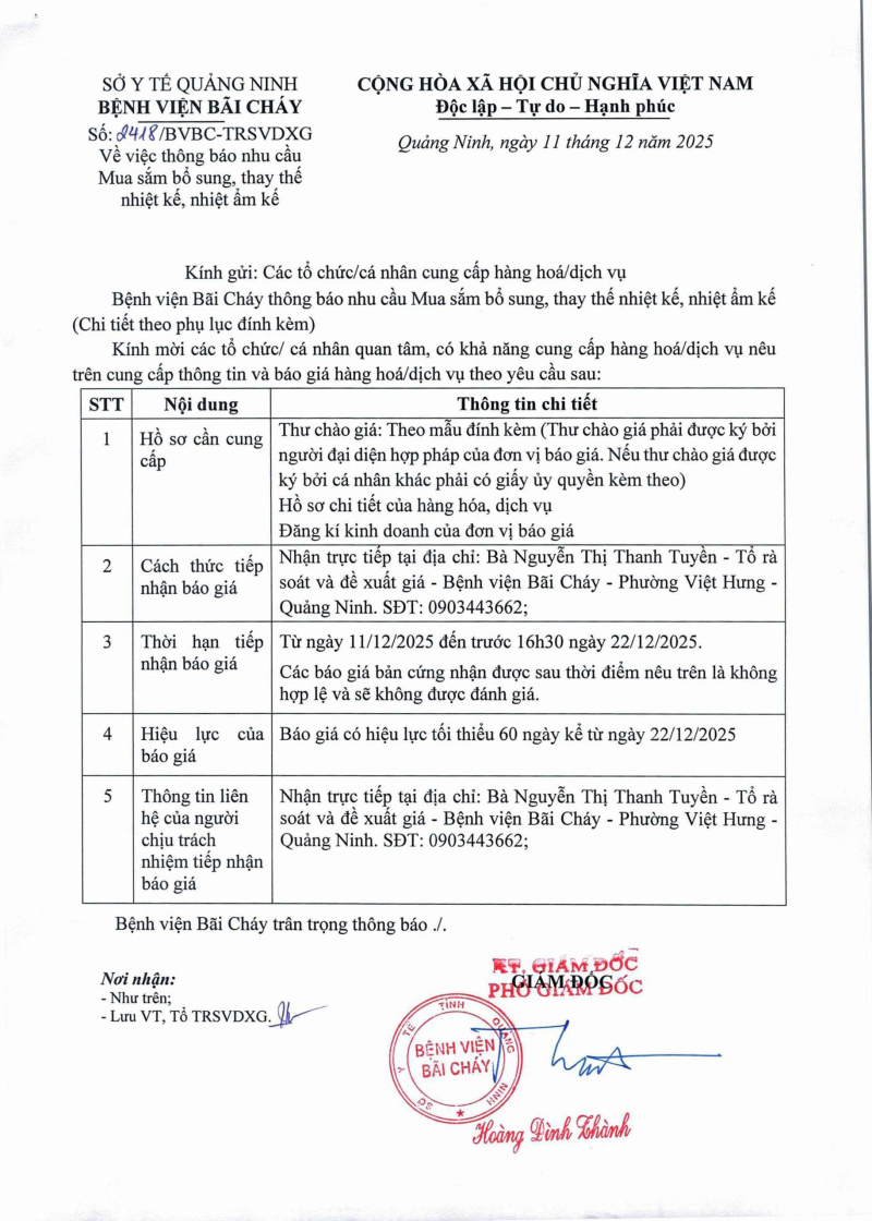 Thông báo 2418 nhu cầu mua sắm bổ sung, thay thế nhiết kế, nhiệt ẩm kế 2025/12/11 03:18 Thông báo 2418 nhu cầu mua sắm bổ sung, thay thế nhiết kế, nhiệt ẩm kế