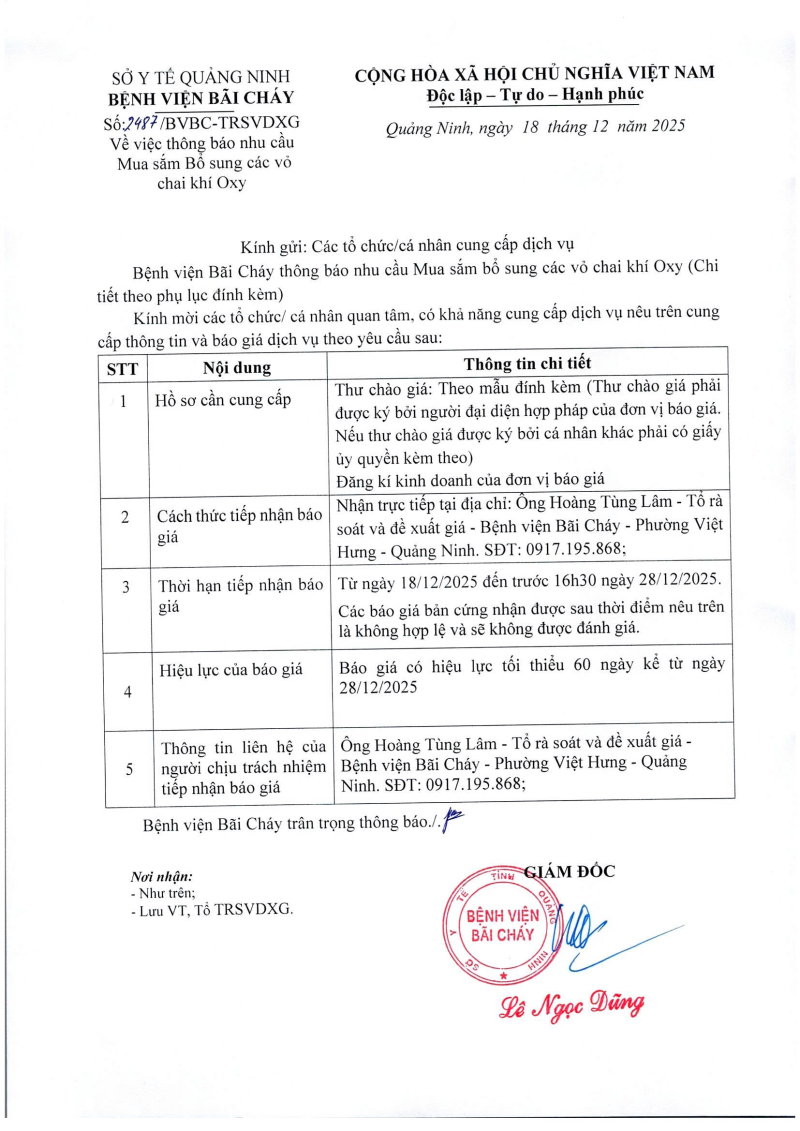 Thông báo 2487 nhu cầu mua sắm bổ sung các vỏ chai khí oxy Hôm nay 09:13 Thông báo 2487 nhu cầu mua sắm bổ sung các vỏ chai khí oxy