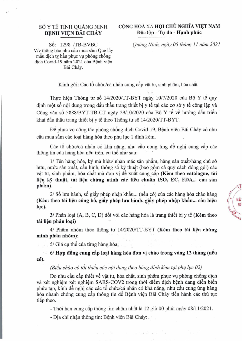 Bệnh viện Bãi Cháy ban hành công văn số 1298/TB-BVBC thông báo nhu cầu mua sắm que lấy mẫu dịch tỵ hầu phục vụ phòng chống dịch Covid-19 năm 2021.